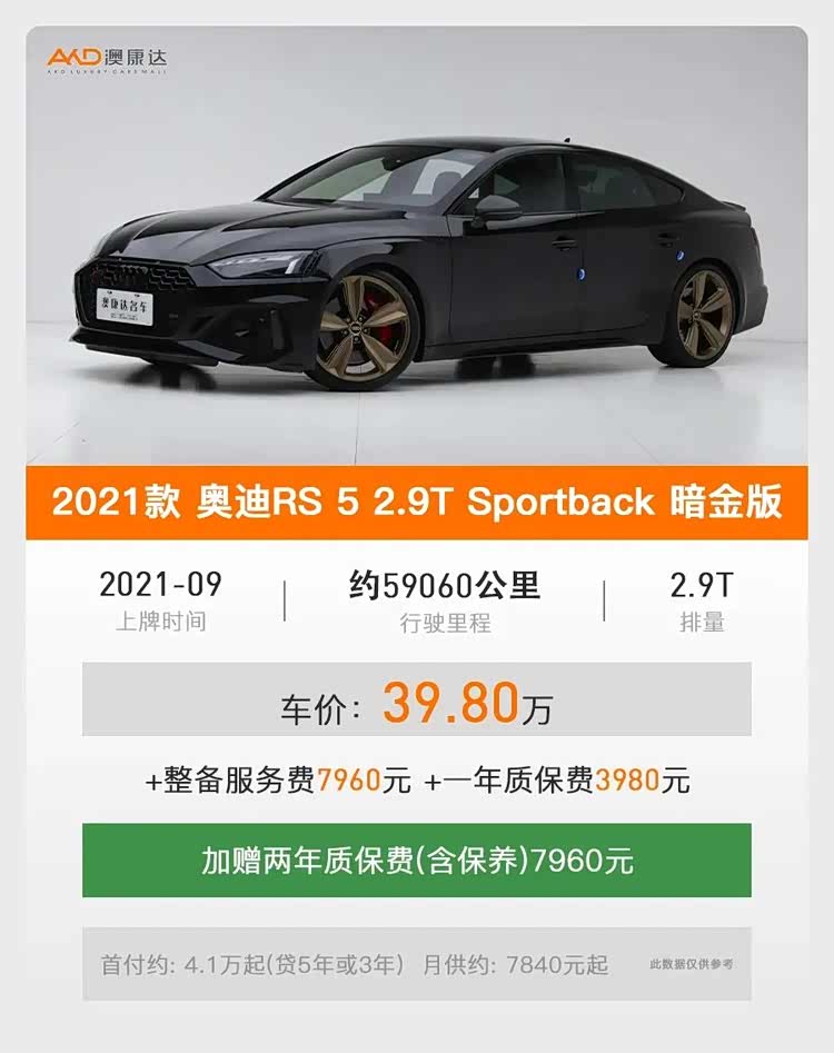 作为奥迪家族中兼具优雅与暴力的高性能轿跑, 奥迪RS 5(参数|询价) Sportback以风骚的四门溜背造型和强大的性能表现,深受车迷的喜爱,当然更重要还少不了价格,而澳康达二手车在售的这辆2021款 奥迪RS 5 2.9T Sportback 暗金版,2021年上牌行驶约5.9万公里,目前的二手车价不到40万哦!