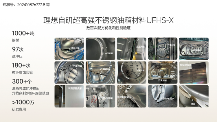 另外还有不锈钢高压油箱,理想自研的UFHS-X不锈钢油箱相比传统的304不锈钢油箱抗穿刺能力提升52%,耐应力腐蚀性直接提升10倍。听理想的不锈钢技术专家说这款材料自研难度相当大,因为要在提升多个维度参数的同时还要保持其他的一些材料特性不会变化,另外还要考虑材料的可加工性、量产等问题。