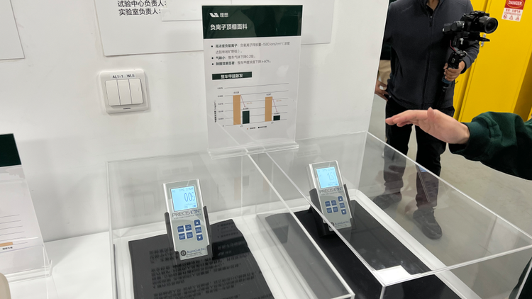 除了从源头控制以外,理想在车内还使用了可以散发负离子的顶配面料,负离子可以吸附带正电的灰尘、甲醛等物质,把小颗粒汇聚成大颗粒然后被空调滤芯过滤掉。这种面料当然无法永久释放负离子,所以理想又在空调系统中加入里负离子发生器,这样就可以保证车内一直有负离子帮用户净化空气。