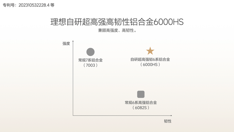 在二者之中妥协当然不够“理想”,所以理想直接自研了一款6000HS超高强度铝型材,相比传统6082铝型材强度提升25%、塑性提升30%,由它支撑的防撞梁变形抗力提升10%且不易发生断裂。6000HS直接让理想获得了3项发明专利,荣获中国汽车工程学会轻量化大赛优秀奖。