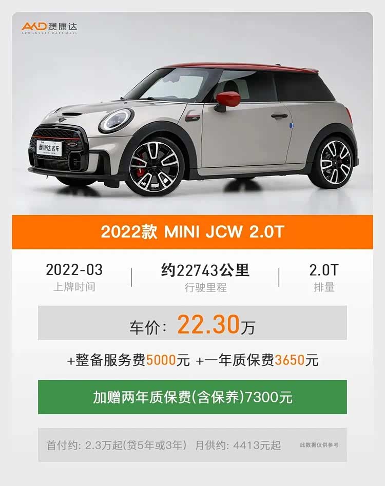 澳康达在售这辆2022款 MINI JCW 2.0T JOHN COOPER WORKS ALL-IN,绝对是个“快乐玩家”!作为MINI家族的高性能版本, JCW(参数|询价)是完美融合了复古设计与暴躁性能的存在,其搭载的2.0T发动机,231马力看着不大但在这部小车上绰绰有余,关键配合精准的操控和灵巧的车身,使其在市区穿梭游刃有余。