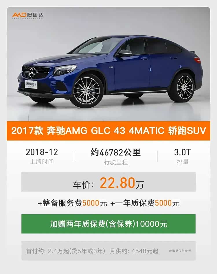 既要性能又要个性还要实用性,那么澳康达二手车在售的这款AMG GLC 43 轿跑SUV就很合适!它属于是完美结合了SUV的实用性与AMG的性能基因的存在,其搭载了一台3.0T V6双涡轮增压发动机,可输出367马力,配合AMG性能调校和4MATIC四驱系统,零百加速仅需4.9秒!