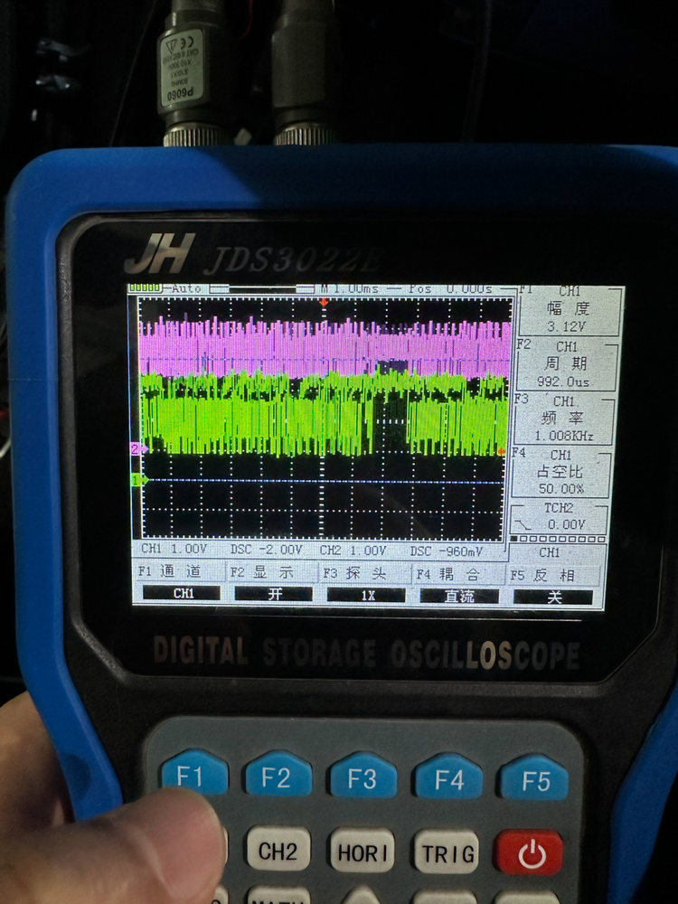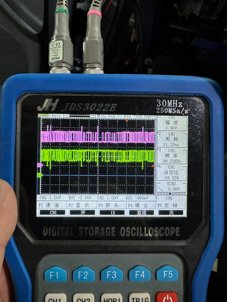技师通过连接CAN线的示波显示器观察到,CAN总线传来的电压波形不对,非常杂乱,对比之下,其他没有故障的Velite 5(这个在我们公司还挺好找的),波形都挺有规律的。