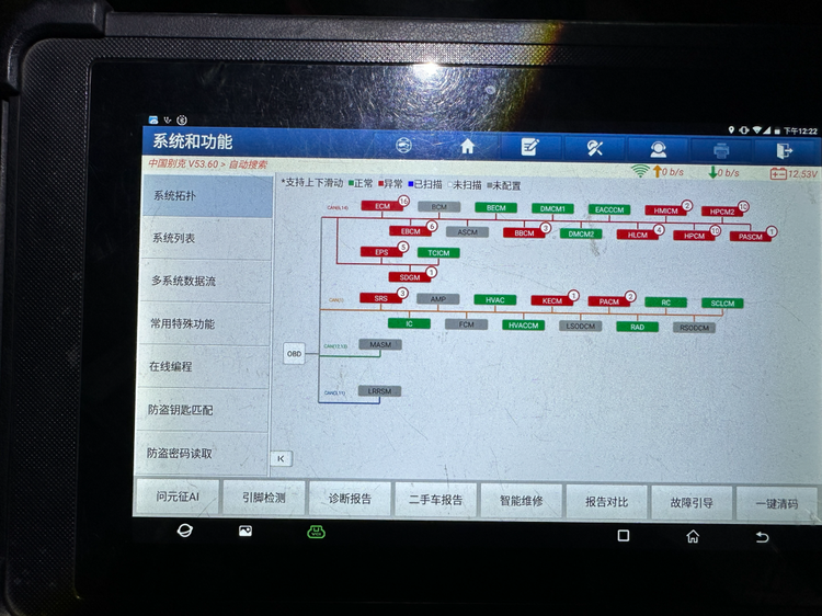 遇到这种“跑马灯”故障,我们一般怀疑就是12V蓄电池坏了,或者是CAN总线故障。相比之下,蓄电池的嫌疑更大。