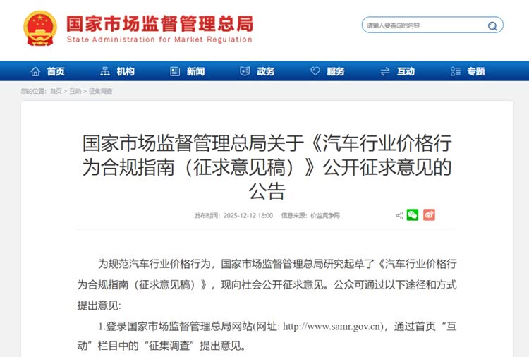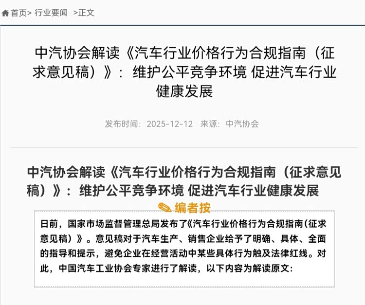 近日,国家市场监督管理总局发布《汽车行业价格行为合规指南(征求意见稿)》。这份文件被行业视为遏制“内卷式”竞争的关键举措。