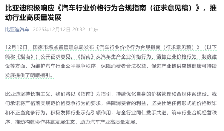 比亚迪承诺将严格规范价格竞争行为的要求,会持续优化自身价格管理和合规体系建设,保障消费者的利益,坚决杜绝任何形式的价格欺诈和不正当竞争行为。