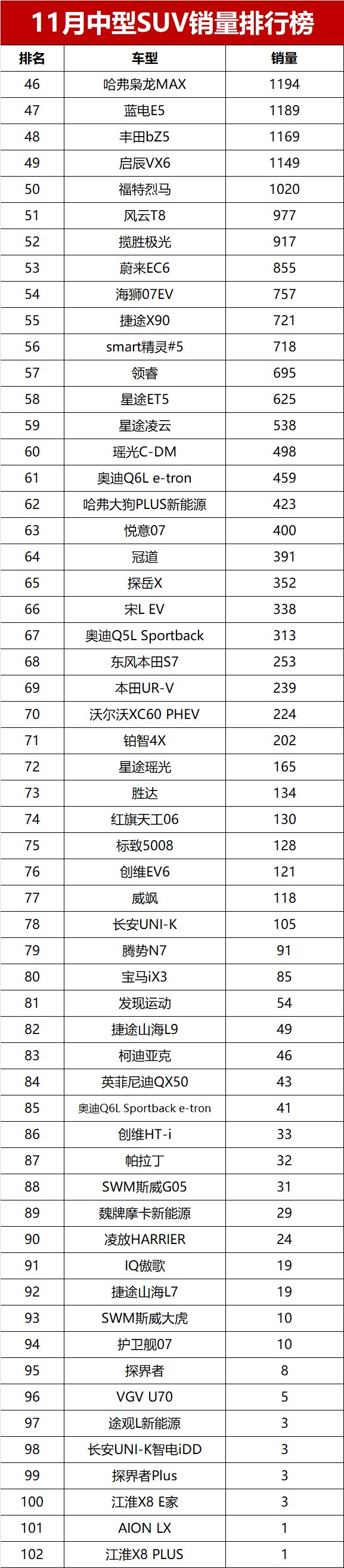 值得注意的是,榜单的后半段清晰地揭示了市场竞争的残酷性。从第40名之后,大量车型的月销量已不足2000辆,甚至许多车型仅能卖出数百台。一些曾经耳熟能详的车型,如本田冠道/UR-V、马自达CX系列等,如今销量已十分低迷。这表明,在中型SUV这个消费者决策更为审慎的细分市场,产品力的任何短板都会被迅速放大,品牌光环的庇护作用正在减弱。