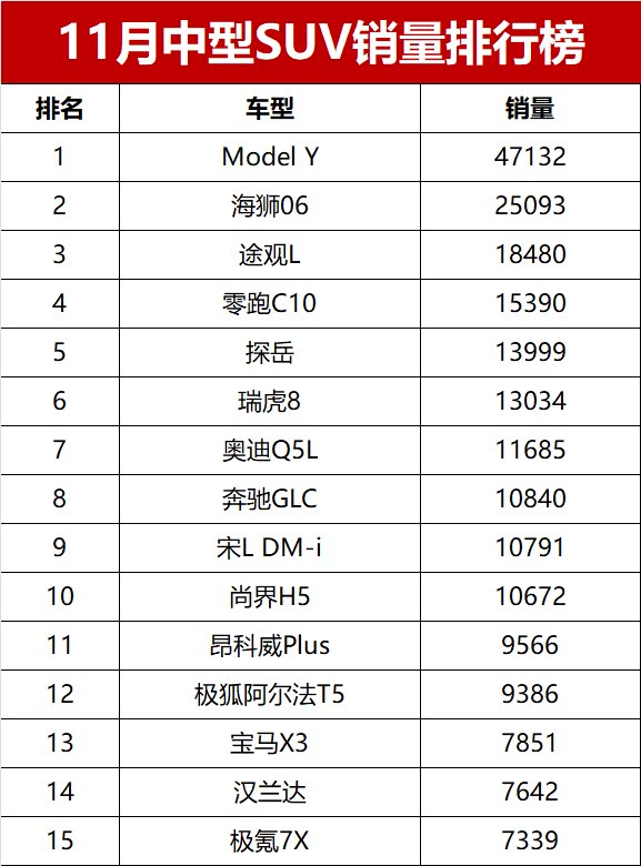 【2025年11月中型SUV零售销量榜】11月的车市,销量数字看着有点冷,但细分市场的暗战一点没停。乘联会刚公布的数据,SUV整体销量比去年同期少了5.6%,不过在中型SUV这个“兵家必争之地”,战况可一点不沉闷。看榜单,几个趋势挺明显:特斯拉Model Y还是一如既往的“猛”,快甩开第二名一倍了;比亚迪新上的海狮06,直接冲到了第二,势头有点吓人;而像 大众途观L(参数|询价)、奥迪Q5L这些老牌选手,虽然还能稳在第一梯队,但脸上的表情,恐怕就没那么轻松了。真是应了那句话,变,才是唯一的不变。