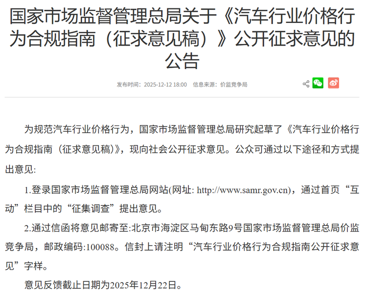 车家号·0浏览·2025-12-15 15:57 · 北京近期,国家市场监督管理总局发布《汽车行业价格行为合规指南(征求意见稿)》(以下简称《指南》),明确规定了车企除依法降价处理积压商品外,不得以其他方式使出厂价低于生产成本;