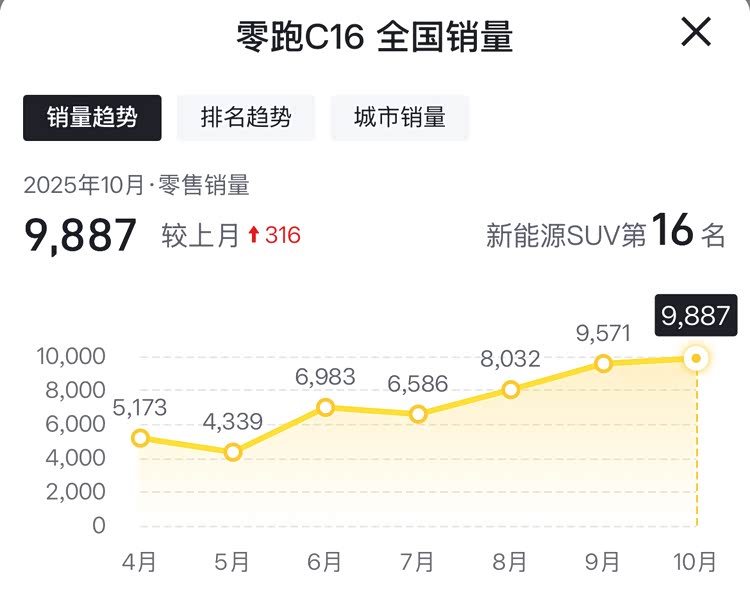其实老百姓买车迷茫的时候,有一个很高效稳妥的选车方法,那就是跟着销量买。2025年10月的销量数据,就很直观的反映了三款车的市场认可度。零跑C16以9887辆的成绩继续热销,奕派008售出3780辆,比亚迪唐DM为5763辆。零跑C16的月销量几乎是奕派008和比亚迪唐DM的销量之和。这样的销量差距,正是三款车综合产品力的直接体现。