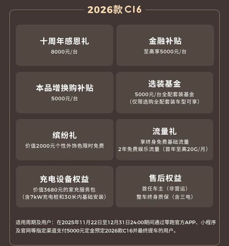 奕派008提车周期约1个月,介于两者之间,售后网点虽不及比亚迪,但服务质量高、响应及时,零部件供应也相对稳定。零跑C16算是等车周期较短的,订车最快7天提车,12月购车享整车终身质保,还免费赠送家充设备,诚意和效率还是挺足的。