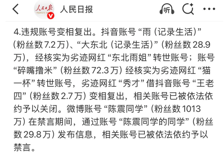 陈震这次和“东北雨姐”等人一样,被划分成为“劣质网红”,不然也不会归类到一起,毕竟这是典型案例通报。