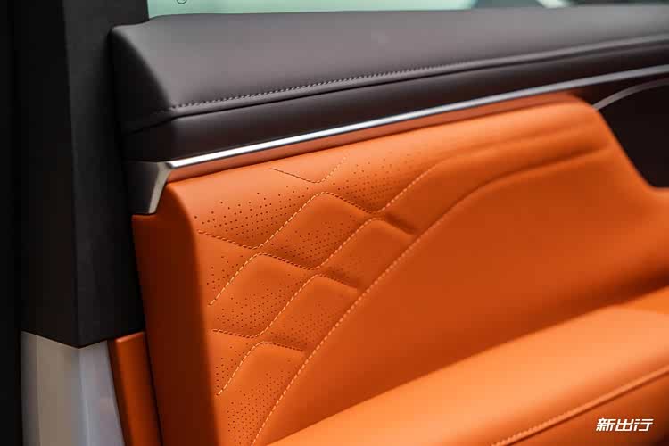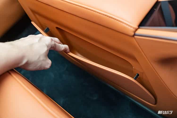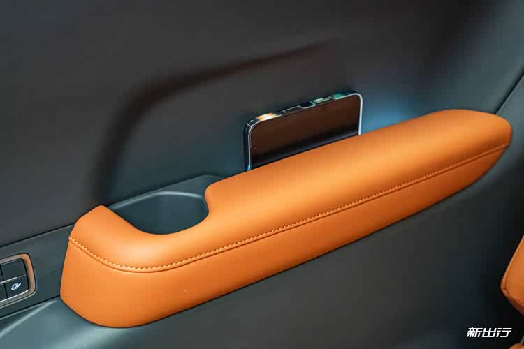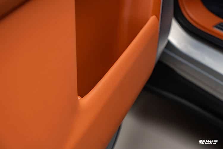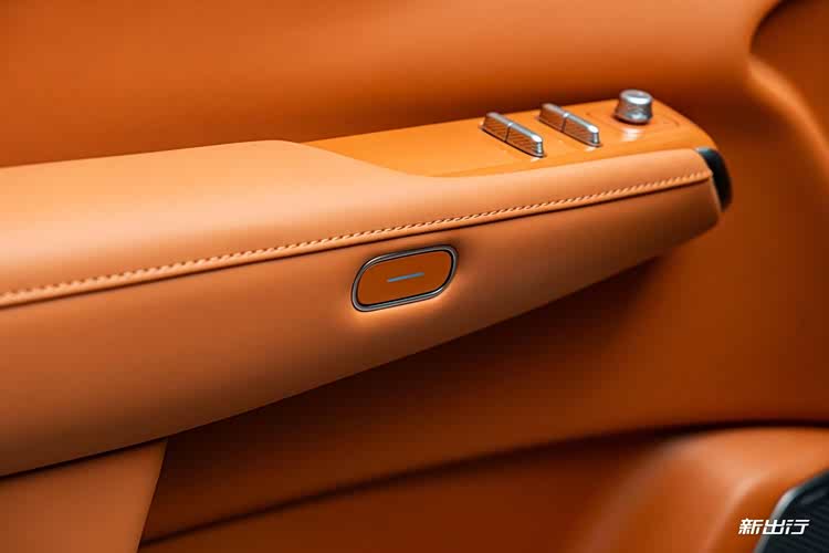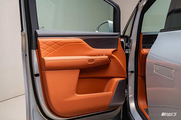 车门采用按钮式控制,门板以大面积皮质与软包包裹,并且在门板下方储物格区域也是软包材质。