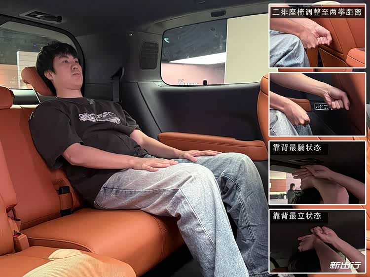 在座椅最后的状态之下,世家腿部空间为两拳富余,大概三拳左右的空间。而头部空间,在最躺状态下大概一拳四指左右的空间,最立状态下为一拳一指左右的空间。