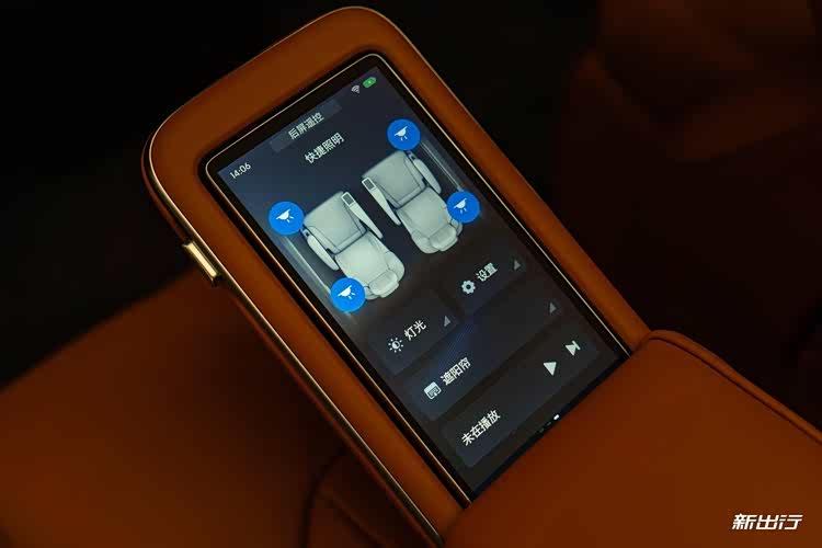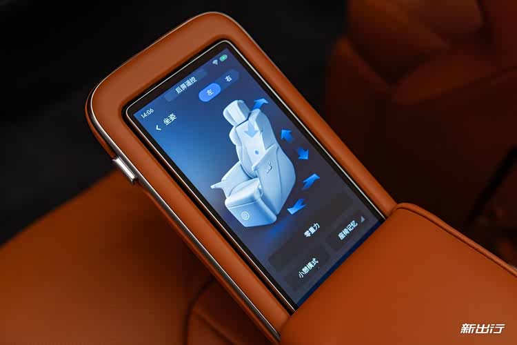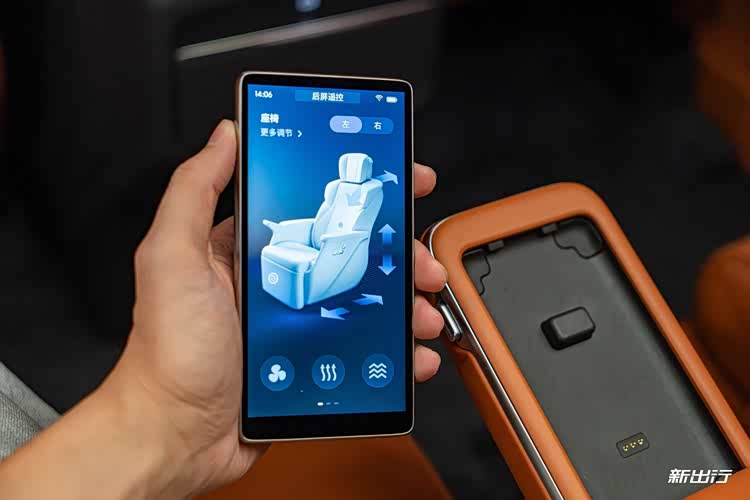 同时,第二排扶手上还集成有 5.5 英寸控制屏,可调节后排座椅、空调、娱乐等功能,支持拆卸手持操作。