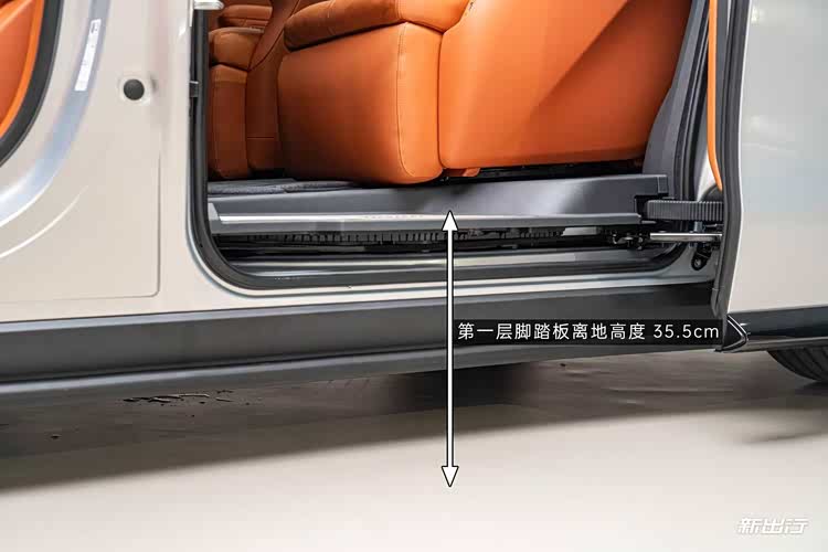 跨进第二排车内空间,后排的地台采用低落差双层台阶设计,实测舒适进出状态下(空悬低状态),第一层脚踏板离地高度 35.5cm。