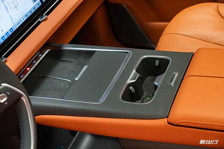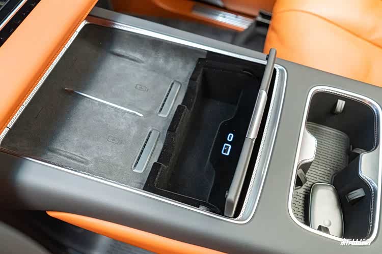 后方则是两个 50W 无线充电面板、带双充电接口的隐藏式储物槽以及两个开放式杯架。