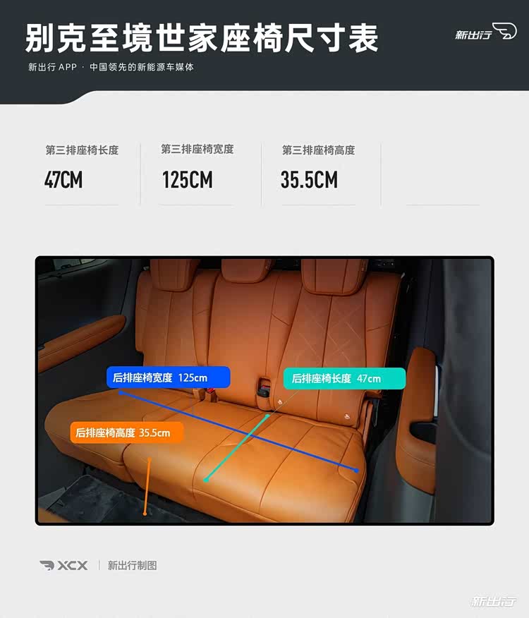 第三排座椅的坐垫宽度为 125cm,坐垫长度为 47cm,坐垫与地台的高度为 35.5cm。