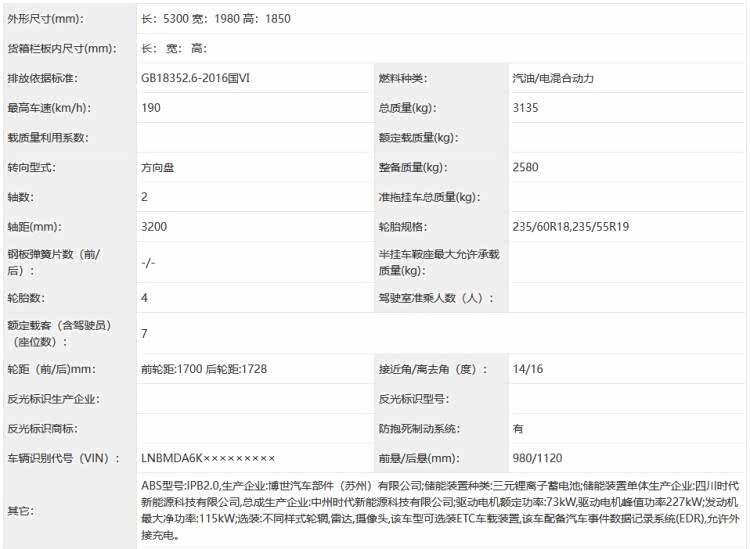 动力方面,新车将采用1.5T+电机组成的增程系统,发动机最大功率118kW,此次申报的仅为单电机版本,电机最大功率227kW,使用磷酸铁锂电池组相信,未来应该也会有双电机版本选择。