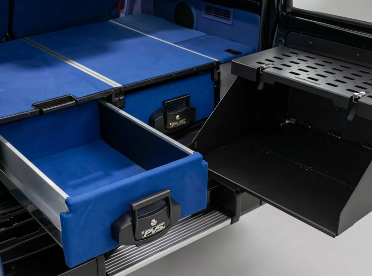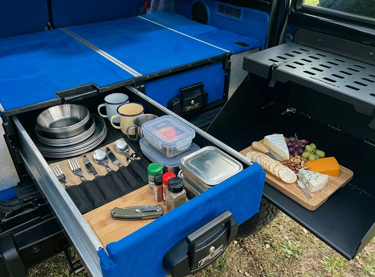 后备箱也做了一定程度的改装,将后备箱的台面抬高之后,做了一套抽屉,并且在其中一侧的尾门上安装了一个小桌子,方便车主在野外也能享受美食。