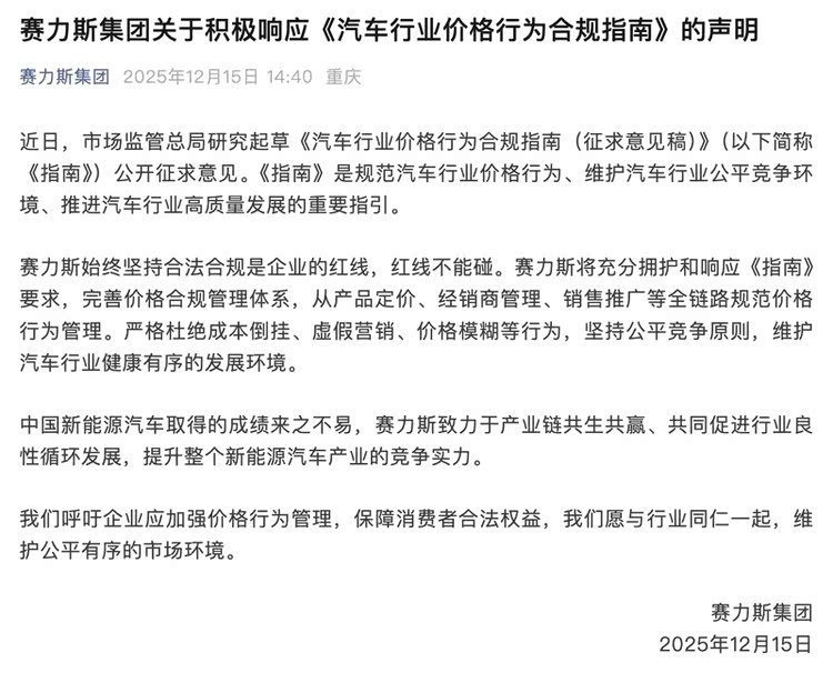 赛力斯集团发布积极响应《汽车行业价格行为合规指南》声明