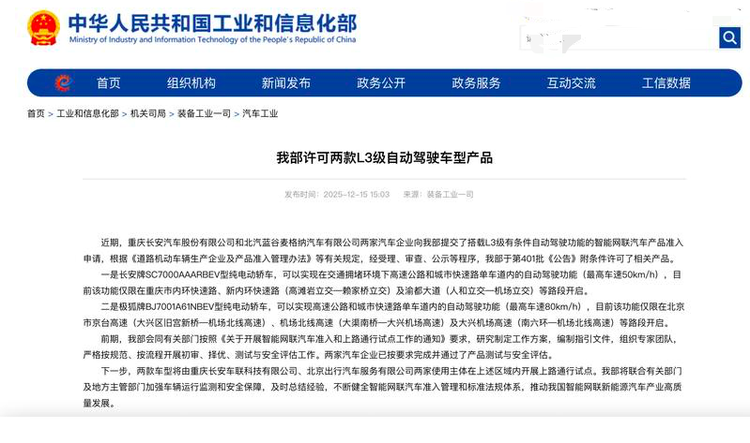 汽车说刊讯|12月15日,工业和信息化部的一则公告标志着中国智能网联汽车产业迎来历史性跨越——长安深蓝汽车、北汽新能源极狐阿尔法S两款搭载L3级有条件自动驾驶功能的纯电动轿车正式获得产品准入许可。