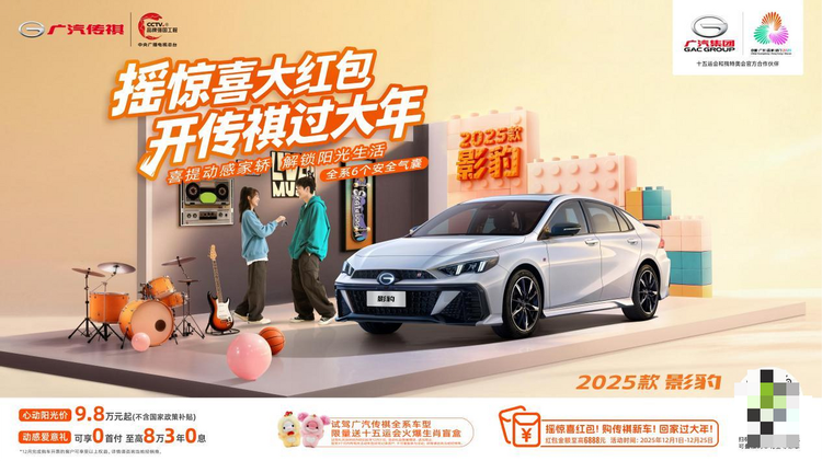要不怎么说影豹最懂年轻人呢,现在年底限时价仅需9.8万元起,还可享受3年8万0息的金融政策,买车也无需降低自己的生活品质!12月1日至12月25日,下订传祺影豹,即可参与抽至高6888元现金红包!手气够旺,一部新手机的钱就省出来了!光看不动?那更亏!12月31日前,只要你来试驾,就能直接把今年的网红顶流——全运会吉祥物“大湾鸡”盲盒抱走!限量萌物免费领回家,稳赚不赔!