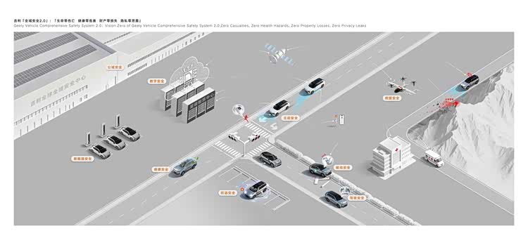与硬件设施同时发布的,还有吉利全面融合“全域AI”进阶打造的 “全域安全2.0”技术体系。吉利联合中汽中心、中国检验认证集团、清华大学等11家产学研机构共同发布了《智能汽车全域安全发展白皮书》。这份白皮书为行业安全发展提供了兼具战略性与实操性的行动纲领。“全域安全2.0”技术体系将侧重“整车安全”的视角升级为 “人-车-路-云-星”的生态视角,贯穿用户出行全场景、覆盖出行全领域、联动出行全生态。