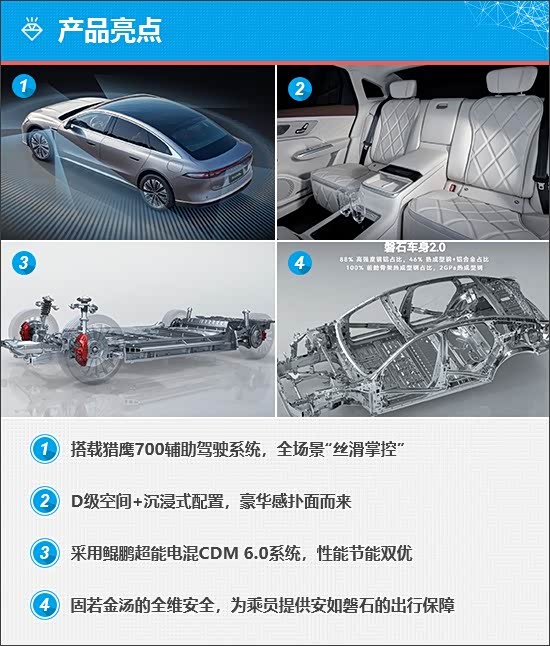 动力层面,新车搭载鲲鹏超能电混CDM 6.0系统,1.5T涡轮增压发动机最大功率115kW,电动机总功率355kW,CLTC纯电续航里程200km。加之其精心调校的前双叉臂、后五连杆独立悬架,以及软硬调节的可变悬架功能,共同确保了车辆在各种路况下都能提供从容稳健的驾控体验,为驾驶者带来充足信心。