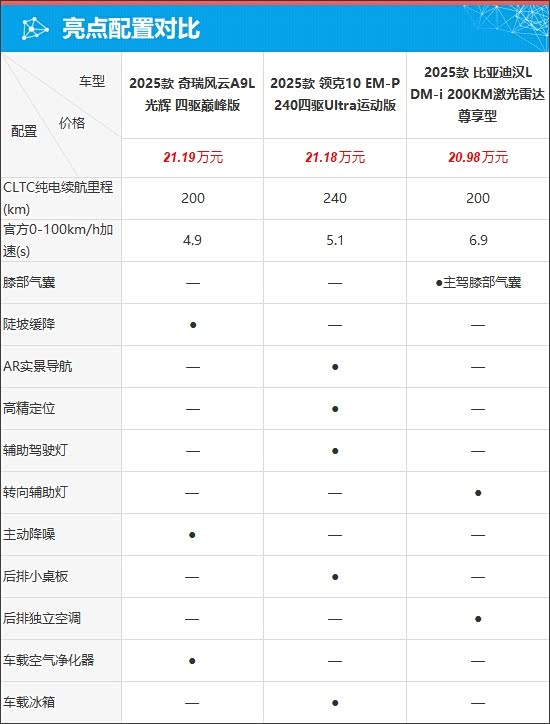具体到车辆配置层面,通过对比来看,三款车型侧重点有所不同。其中,2025款奇瑞风云A9L百公里加速最亮眼,配置上独享陡坡缓降、主动降噪以及车载空气净化器;2025款领克10 EM-P不仅CLTC纯电续航里程最长,更是独享AR实景导航、高精定位、辅助驾驶灯以及后排小桌板等功能;2025款比亚迪汉L则独享主驾膝部气囊、转向辅助灯等。由此可见,三款车型的核心价值主张各不相同。