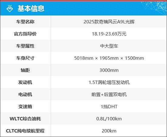 奇瑞风云A9L光辉共推出4款车型,官方指导价18.19-23.69万元,超级置换价格区间为17.19-22.69万元。
