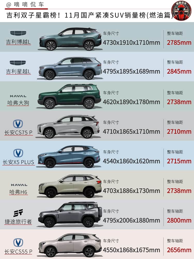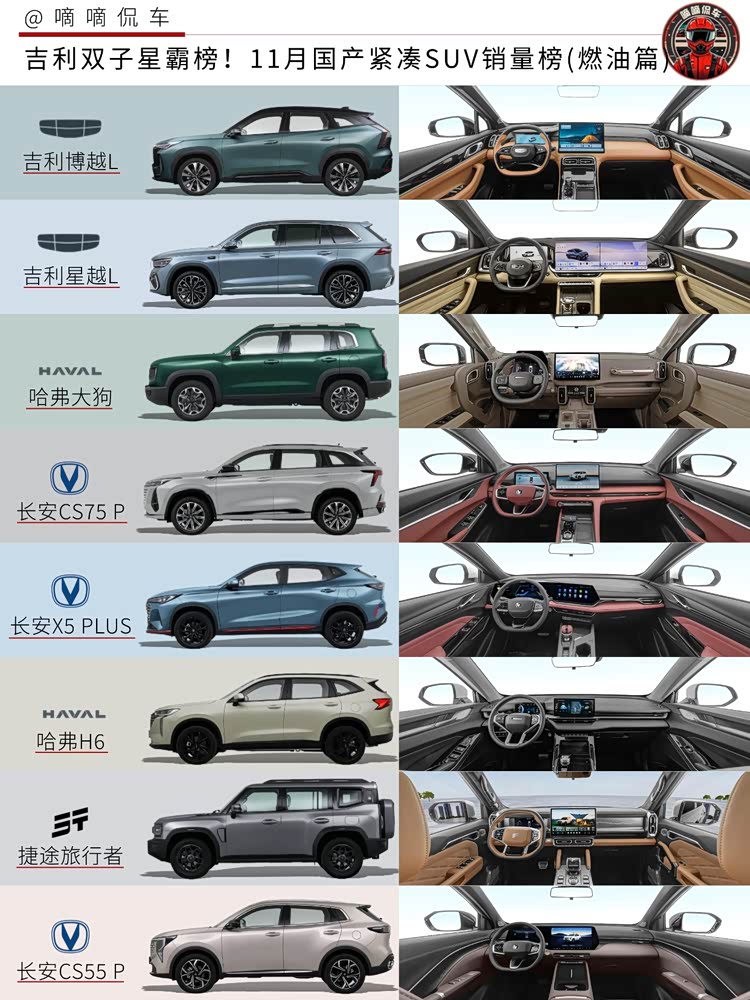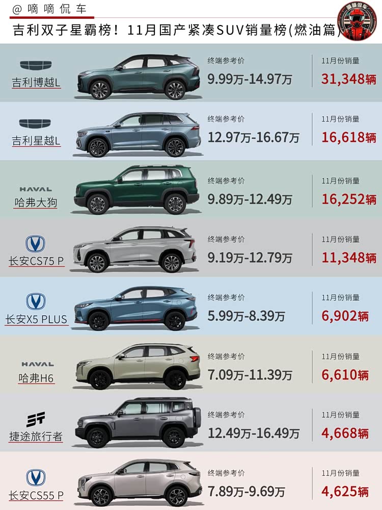 ⭕️现阶段国产车型各方面都不可同日而语,发产品力越来越好,受到不少小伙伴的欢迎,本期嘀嘀给大家盘点11月份国产紧凑型SUV(燃油)销量榜,大家购车之前可以作参考!