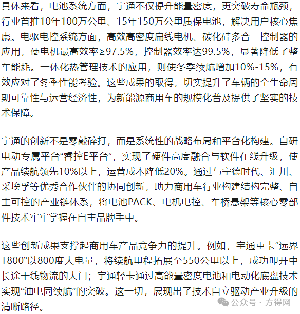 “十四五”期间,宇通以商用车领域共性的安全、效率、节能及产业化能力等为切入点,持续加大研发投入,年均占营收5%以上,组建了超3000人的研发团队和多个国家级、省级研发平台。持续高强度的投入带来了丰硕成果,集中体现在新能源核心技术的自主可控与突破上,在电池、电机、电控、电驱、电桥“五电”领域,技术标准、可靠性、竞争力及产业化能力行业领先,并第四次荣获国家科学技术进步奖。