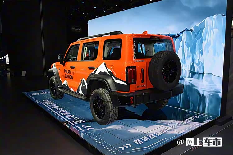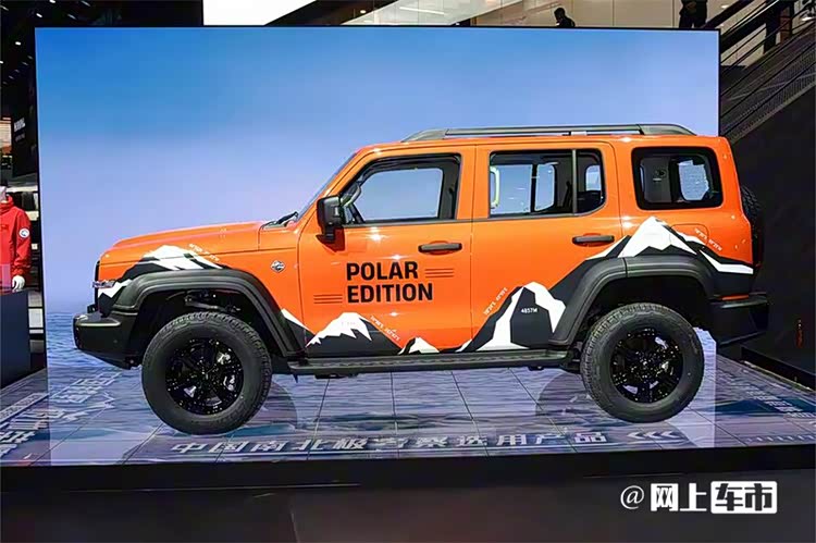 坦克300极地版,原厂还标配了AT胎、9500磅的无线遥控绞盘和2.5吨的拖挂资质。不光这些,前风挡和雨刮喷嘴也支持加热,不仅能远程除霜融积雪,也不怕玻璃水喷不出来了。外观采用的是橙色配色,这橙色可是南极科考队救援车的标志颜色。车身拉花,前边是北极的最高峰,后边是南极的最高峰。