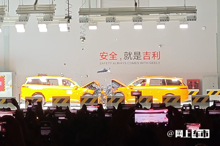 吉利在现场举行了正式揭幕后的第一次测试,两台 领克900(参数|询价)在所有人的面前进行了一次100%正面对撞测试。