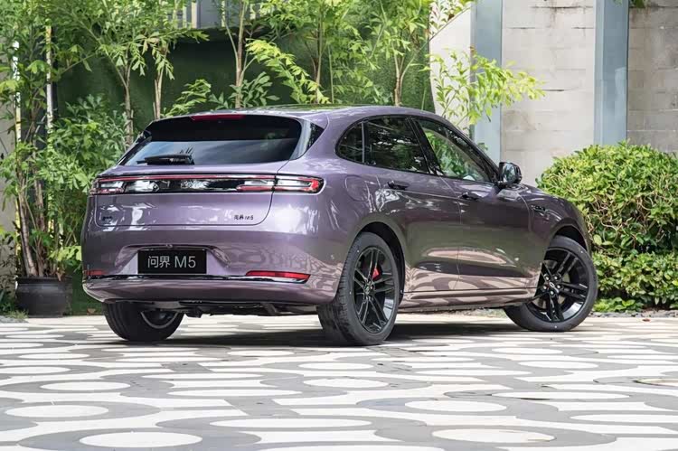 而且从侧后方向来看,问界M5其实有一些比较动态车身效果,比如它快速下降的车顶、比如倾斜度较大的D柱掀背,再比如带有C型光带的宽幅贯穿尾灯等等,这些其实都算是车辆跟更高级别问界SUV的主要差异化。不过,这种宽幅尾灯放在当下看上去确实要显得“传统”一些了,而后保险杠中的高亮银色光带可能跟所谓的“年轻”也挂不上钩。
