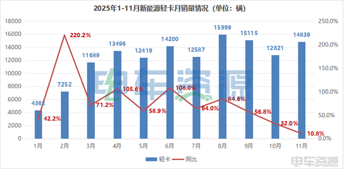 据电车资源最新销量数据,2025年11月,新能源轻卡销量为14839辆,保持较高水平,但同比增长仅为10.8%,成为今年1-11月中同比增速最低的月份,反映出市场增长动力在年末有所减弱。1-11月,新能源轻卡累计销量134779辆,同比增长40.8%。