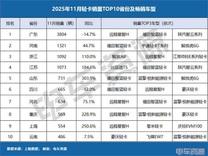 2025年11月的新能源轻卡市场,在地域层面呈现出极为鲜明的分化特征。头部省份的销量规模与增长动能差异巨大,而不同区域对车型品牌的偏好,则精准勾勒出各大车企在全国市场的势力版图与竞争策略。