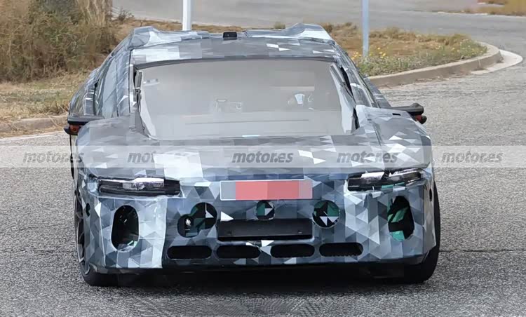 车身侧面虽被厚重伪装覆盖,但2915mm左右的轴距(参考经典车型优化)配合短后悬布局,既保证内部空间,又强化了运动比例。轮胎拥有大尺寸的盘刹和倍耐力P Zero系列性能胎,黄色制动卡钳与高性能轮胎的组合,既暗示其强悍的制动性能,也为应对电机瞬时高扭矩提供了充足抓地力。车尾设计凸显工程实用属性,棱角分明的体块分割与优化的扩散器结构,可有效收束尾部气流、控制尾涡,减少高速风噪与能耗。值得关注的是,测试车尾部预留的中置布局空间,预示着量产版可能采用更具战斗气息的排气设计。
