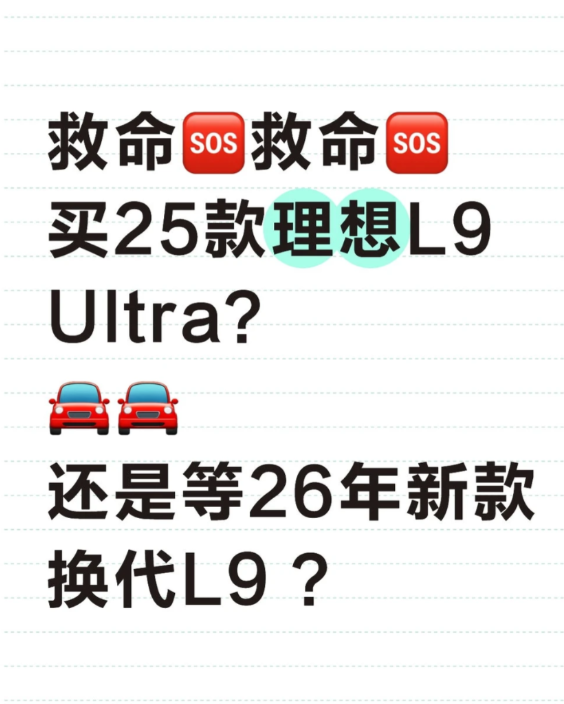 这场纠结的底层,是 **“消费理性” 和 “技术崇拜” 的平衡 **:新能源汽车的迭代确实快,但不是每一次升级都值得等。理想 L9 的核心价值,从来不是 “最新的技术”,而是 “刚好满足家庭需求的体验”。