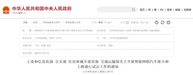 早在2022年11月,工信部即发布了《关于开展智能网联汽车准入和上路通行试点工作的通知(征求意见稿)》,首次明确提出将对L3、L4级自动驾驶车辆进行准入管理并开展试点。
