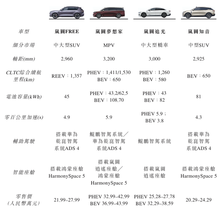 岚图汽车的产品覆盖轿车、SUV及MPV三大细分市场。自成立以来,公司推出了四款车型系列,即中大型SUV 岚图FREE(参数|询价)系列、MPV岚图梦想家系列、中大型轿车岚图追光系列和中型SUV岚图知音系列。