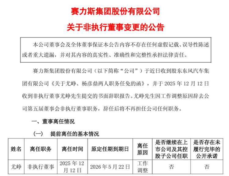 12月13日,赛力斯发布公告,非执行董事尤峥因为工作调整原因,辞去公司第五届董事会非执行董事的职务,辞任后不再担任赛力斯任何职务。