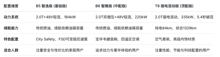 对于大多数家庭用户而言,B6智雅版提供了最佳的价值平衡。它在动力上比B5版本更充沛,同时拥有宝华韦健音响等高端配置,能满足绝大多数场景下的豪华体验需求。而T8插电混动版则适合那些既追求强劲动力又重视节能环保,且预算充足的消费者。