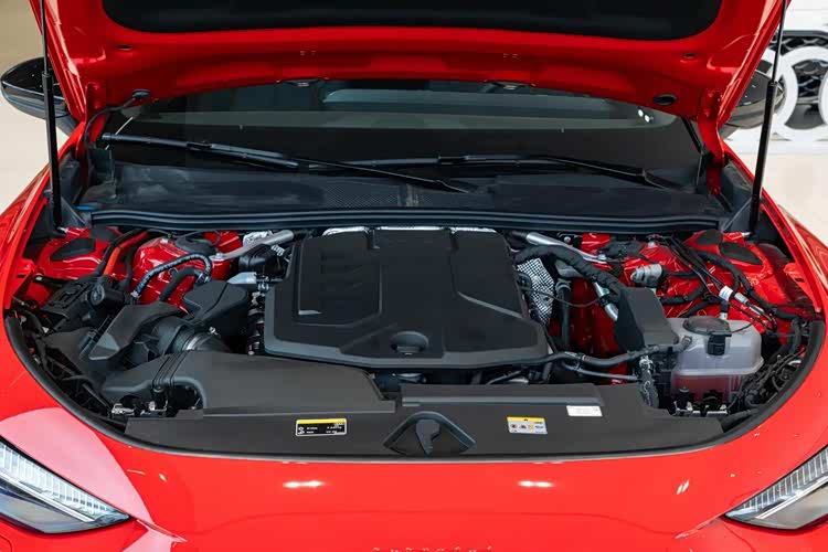 车内的装潢主要采用的是红色元素进行点缀,方向盘、座椅等地方利用红色缝线进行勾勒,搭载Microfiber超纤绒与Laedana超纤皮双拼材质座椅,车顶同样配备Microfiber超纤绒材质,辅以竞速碳纤维饰板,提升内饰质感与运动氛围。11.9英寸液晶仪表和14.5英寸的中控屏组成了曲面双联屏,全系标配有10.9英寸的副驾驶屏,支持无线 CarPlay/Android Auto 互联。空间上,以小编1.8 米的身高乘坐时膝盖仍有两拳余量,头部空间也能保证一拳左右,摆脱了轿跑车型 “空间局促” 的刻板印象。此外,该车还配备 Bang & Olufsen 3D 环绕音响、Bang & Olufsen 前排头枕音响、光境氛围灯、掀背式后备箱。