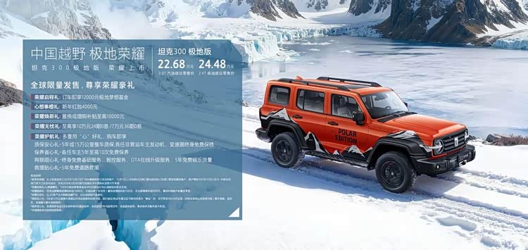 今天咱们聊个真·行业大事——22.68万起, 坦克300(参数|询价)极地版正式上市了。但你可别把它当成一款普通车的改款,往小了说,这是50万坦克用户的共创狂欢;往大了说,这是中国硬派越野真正站上世界舞台的一次“亮剑”。