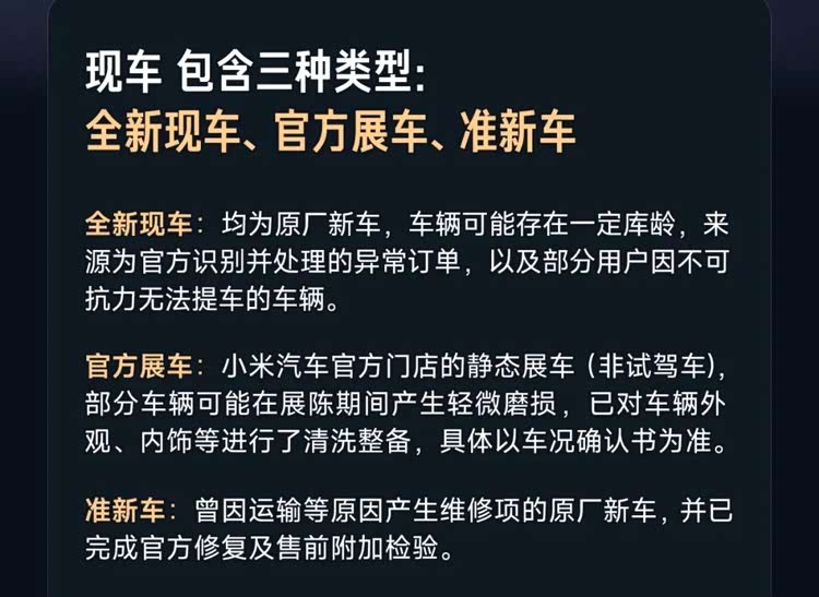 官方说现车来源包括:全新现车、官方展车、准新车。