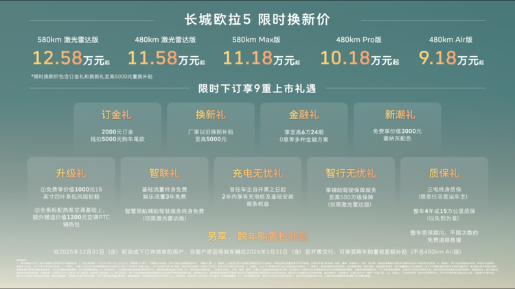 2025年12月16日——今日,长城汽车欧拉品牌全新A级纯电SUV——长城欧拉5正式上市。新车共推出5款配置,建议零售价区间为 9.98万至13.38万元,限时换新价9.18万元起(限时换新价包含“订金礼”和“换新礼”至高5000元以旧换新补贴)。为回馈广大用户的热爱与支持,即日起至2025年12月31日,用户下订并锁单即可尊享包含订金礼、换新礼、智行无忧礼在内的9重上市好礼,以及跨年购置税补贴(不含480km Air版)等丰厚购车权益。凭借诚意十足的价格权益与越级产品力,长城欧拉5致力于成为全球年轻用户的“严选搭子”。