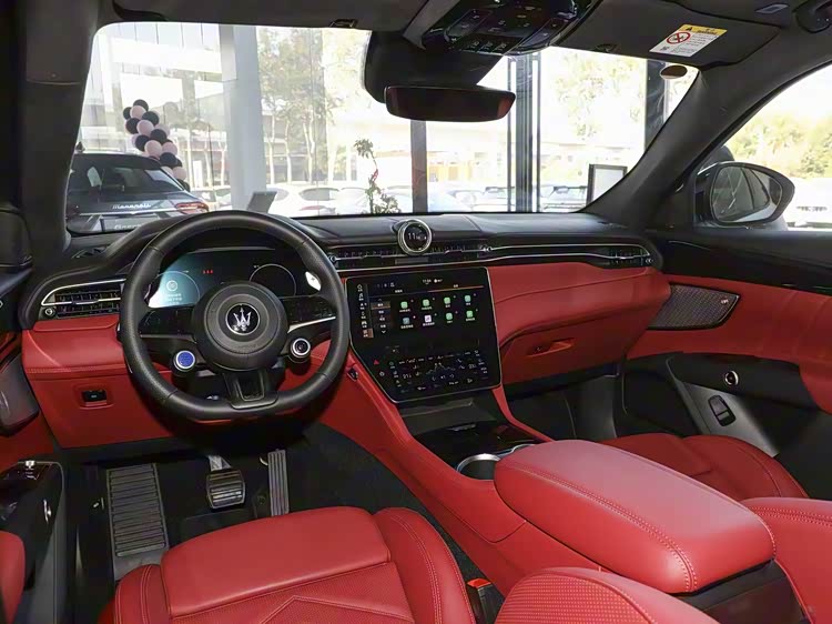 进入车内,内饰延续玛莎拉蒂的意式奢华风格,大面积真皮包裹搭配碳纤维饰板,提供巧克力棕、黑蓝双色等经典配色,缝线工艺细腻,触感柔软细腻。科技配置方面,配备 12.3 英寸全液晶仪表 + 12.3 英寸中控屏 + 8.8 英寸功能触控屏的三屏组合,操作逻辑清晰,支持 CarPlay/CarLife 互联与语音控制,标配可自定义数字时钟,仪式感拉满。储物方面,常规后备厢容积 535L,可容纳两个 28 寸行李箱 + 杂物,放倒后排座椅后扩展至 1600L,纯电版额外增加前备箱(可容纳 20 寸登机箱),储物实用性拉满。