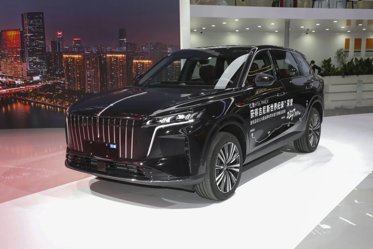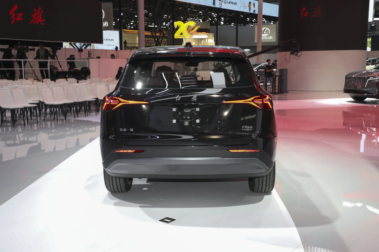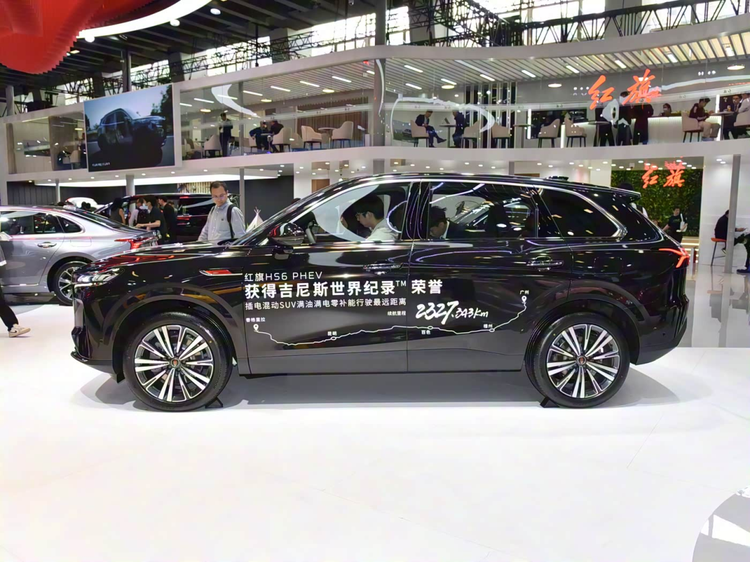 来到车身侧面,整体设计较为流畅,造型饱满流畅,微微上扬的腰线,采用无边框后视镜,传统造型门外拉手,延续红旗一贯的家族化红色标识。车身尺寸4900*1960*1730mm,轴距为2900mm,采用大五座设计,定位中大型插电式混动SUV。配备两种样式的20英寸轮圈。